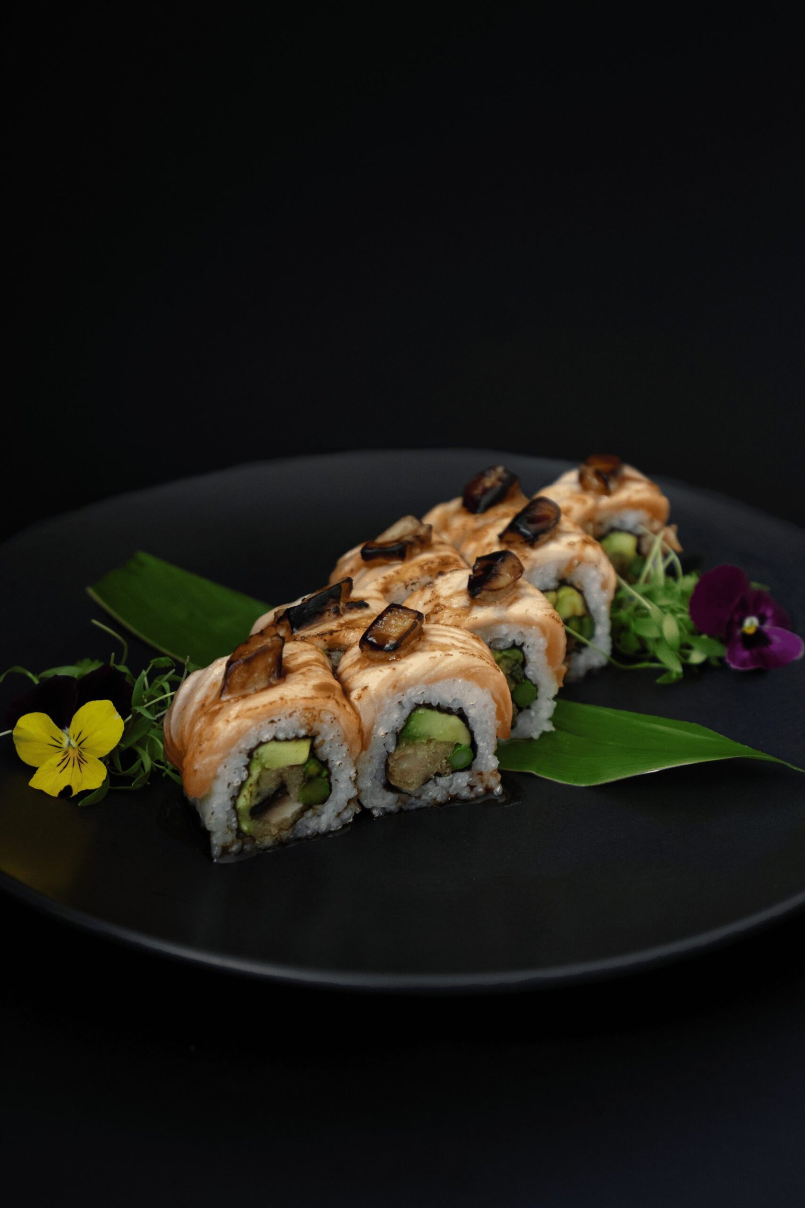 Por dentro: Elote baby tempura y aguacate Por fuera: Salmón, foie gras flameado y salsa dulce