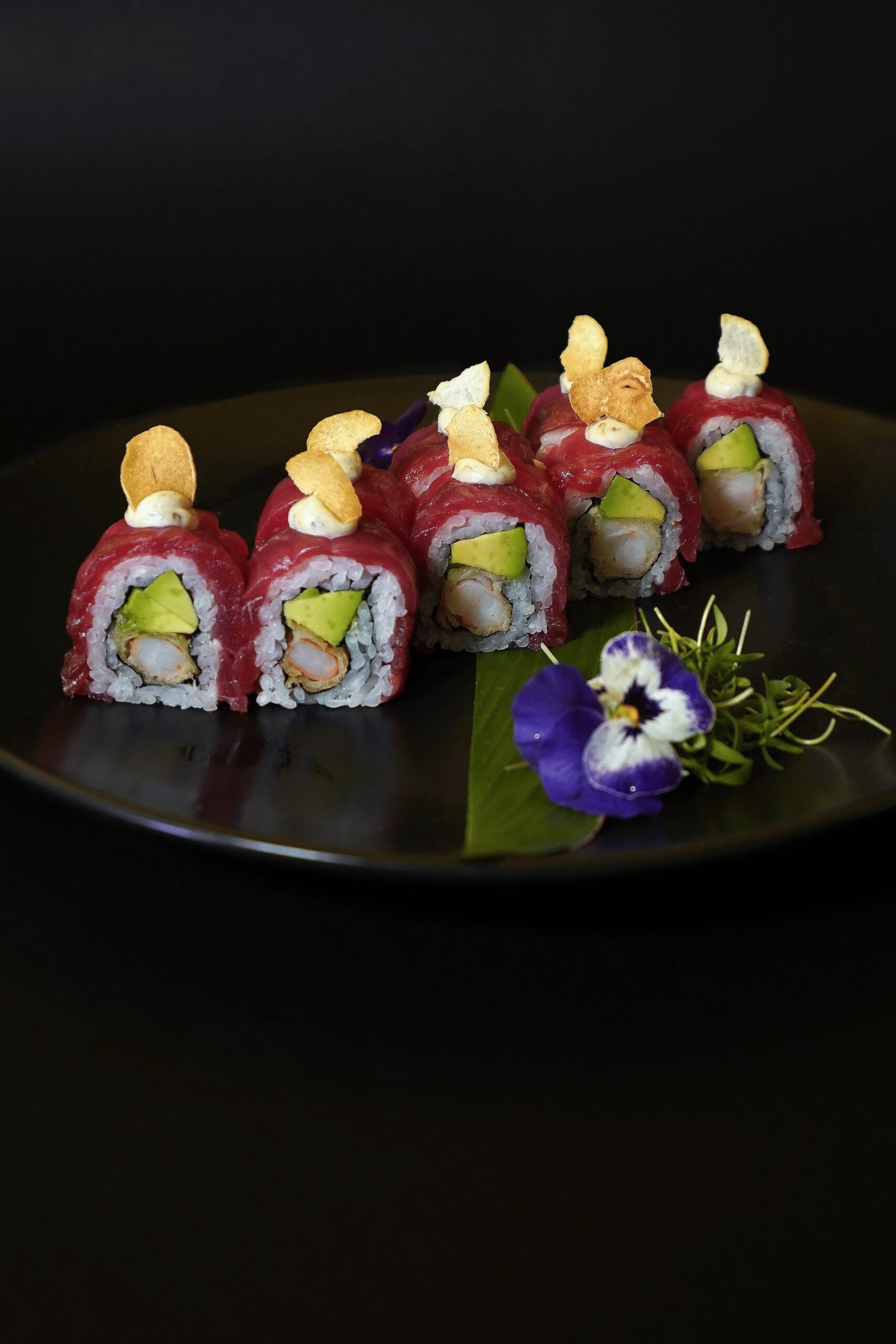 Por dentro: Camarón tempura y aguacate Por fuera: Akami, alioli de trufa y chips de ajo