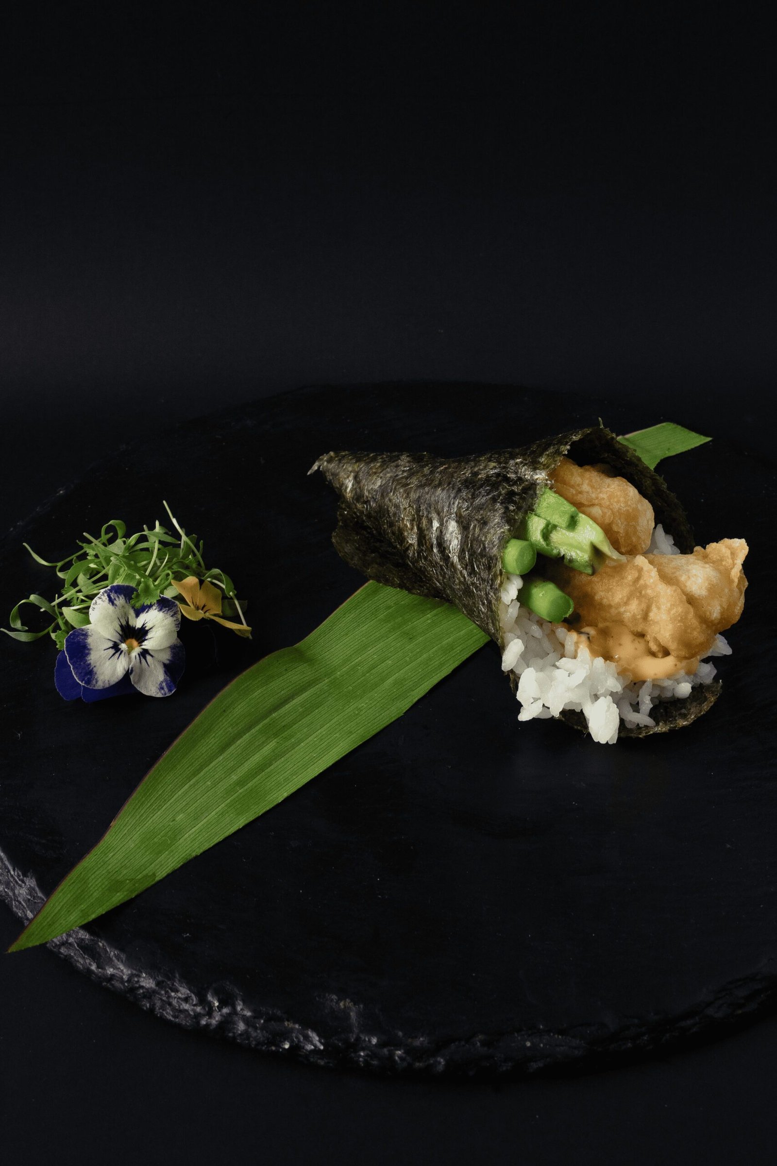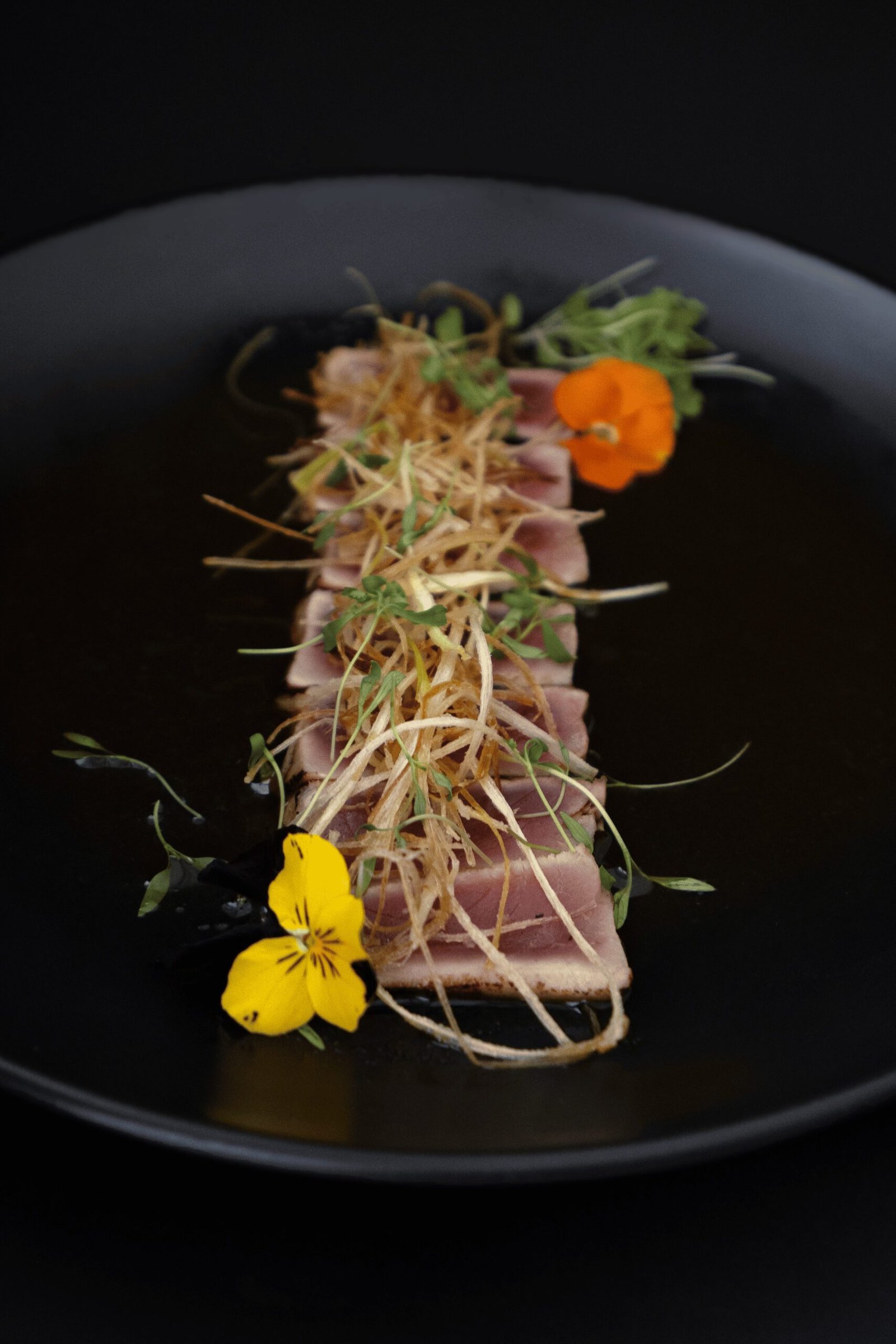 Akami sellado y cortado en láminas finas, acompañado de salsa yuzu-ajo, poro frito y brotes de cilantro.