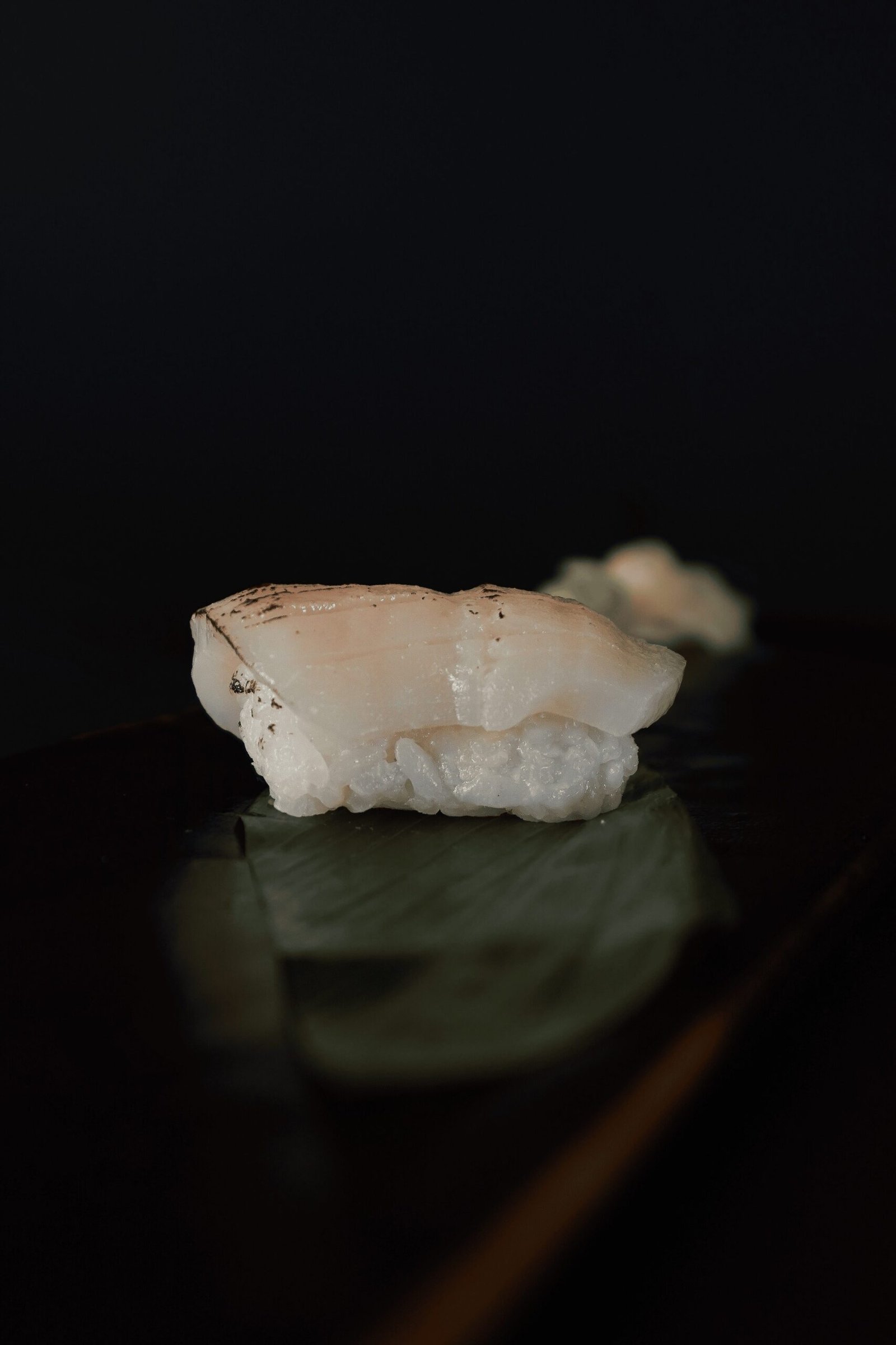 Cono de alga nori relleno de arroz de sushi y callo de hacha flameado con mantequilla de la casa.
