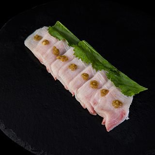 Lámina de lobina rayada sobre arroz de sushi, con un toque de ralladura de limón.