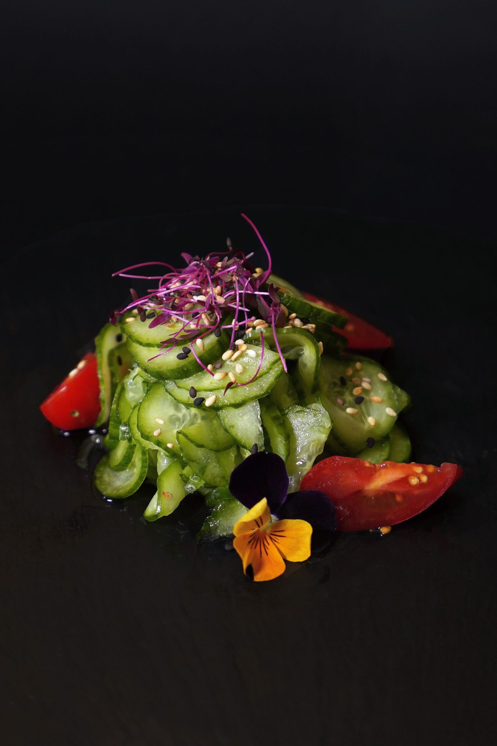 Hamachi fresco en finas láminas, acompañado de salsa yuzu-ajo, rodajas de chile serrano y brotes de cilantro.