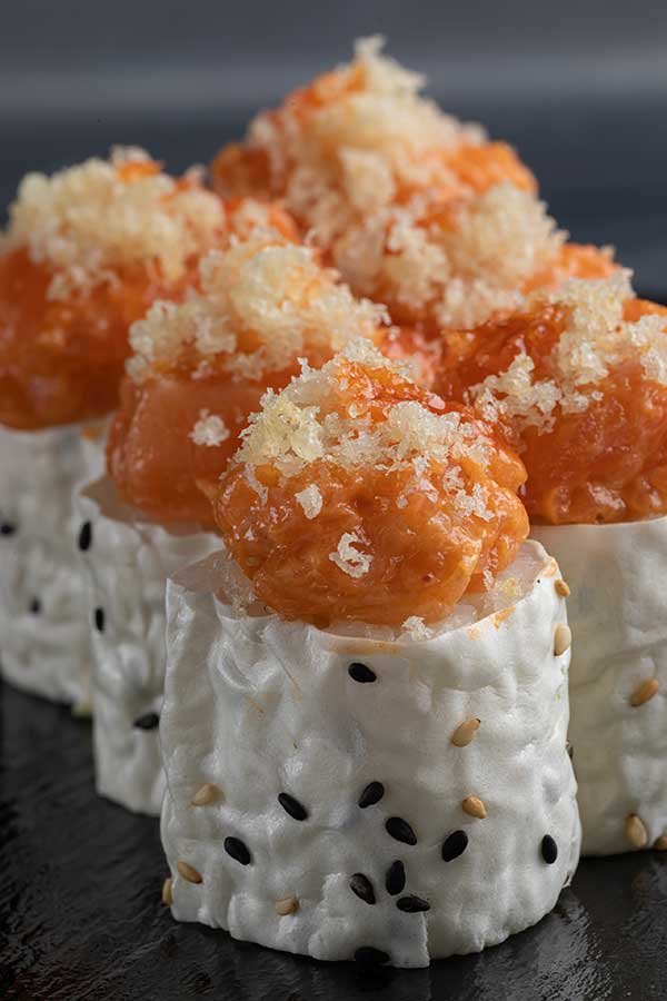 Por dentro: Chile serrano, pepino y cebollín. Por fuera: Hoja de soya, salmón spicy, tempura flakes y salsa Kaji
