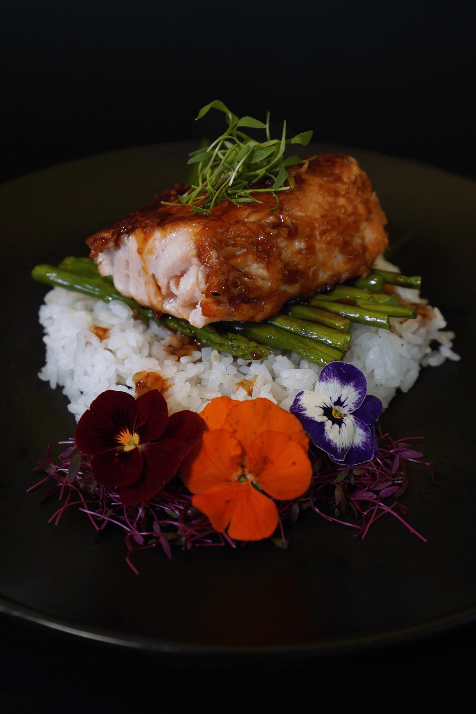Salmón a la plancha, glaseado con salsa teriyaki. Acompañado de espárragos y arroz gohan.