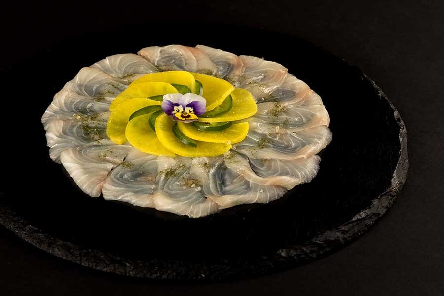 Hamachi fresco en finas láminas, acompañado de salsa yuzu-ajo, rodajas de chile serrano y brotes de cilantro.